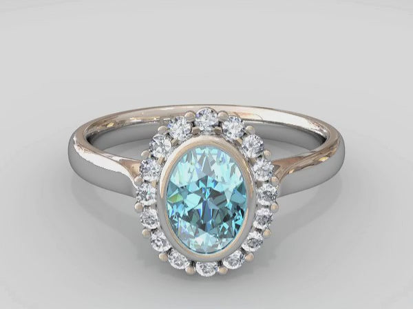 This exquisite engagement ring features a stunning oval-cut aquamarine centrepiece surrounded by a dazzling halo of diamonds. Crafted with care using Fairtrade Gold or platinum, it beautifully combines ethical sourcing with timeless elegance. Perfect for celebrating your love with a meaningful and radiant symbol that will be cherished forever.